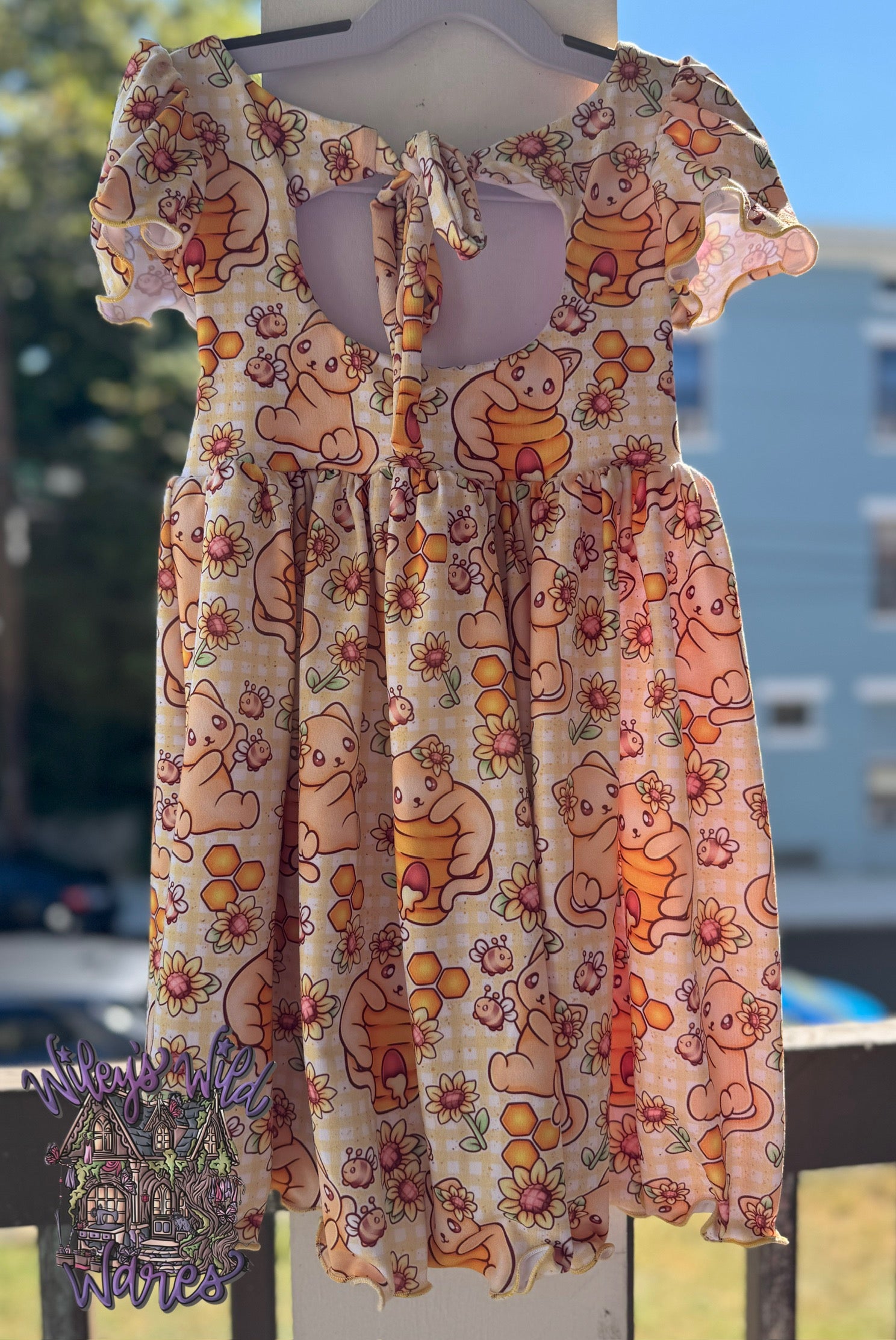 This adorable dress has a tie back feature, comes with puff sleeves, and a gathered skirt!