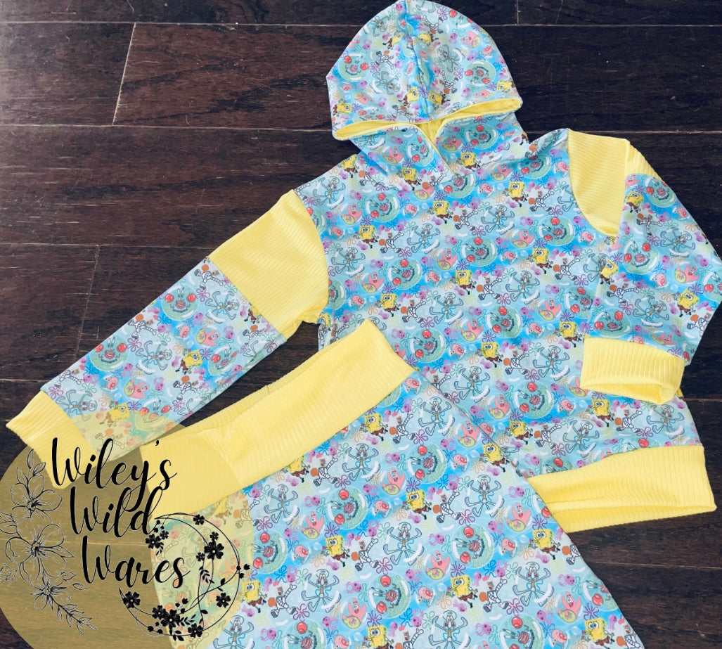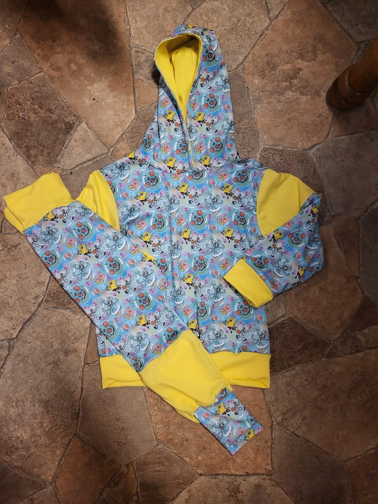 This cute color blocked hoodie & jogger set is perfect for lounging around in, getting , active, or just looking cute in your favorite prints!