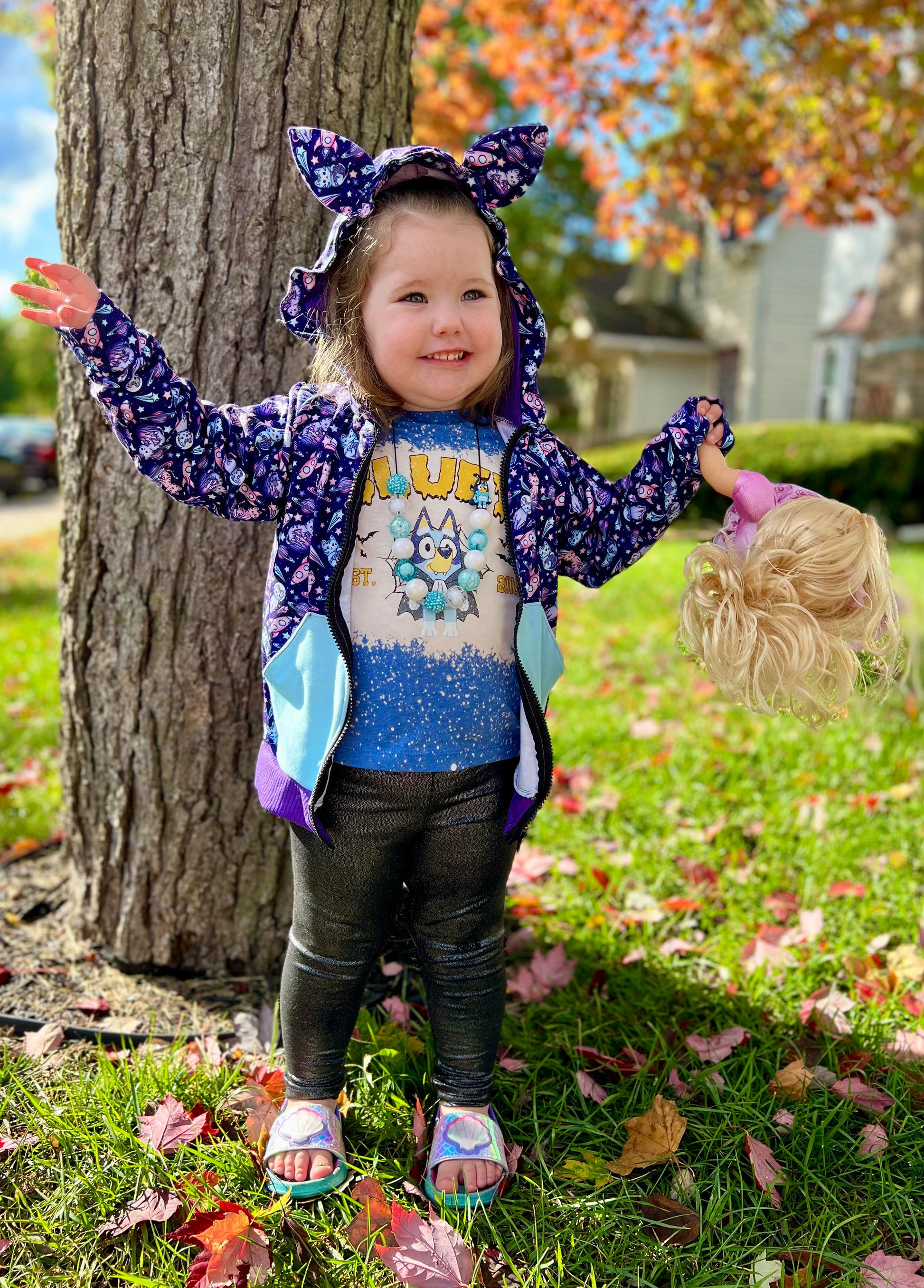 These zip-up hoodies can come plain or with animal features such as ears, wings, or spikes. They come with 2 standard pockets. You can pick between squish, fleece, french terry, or heavy dbp as the fabric!